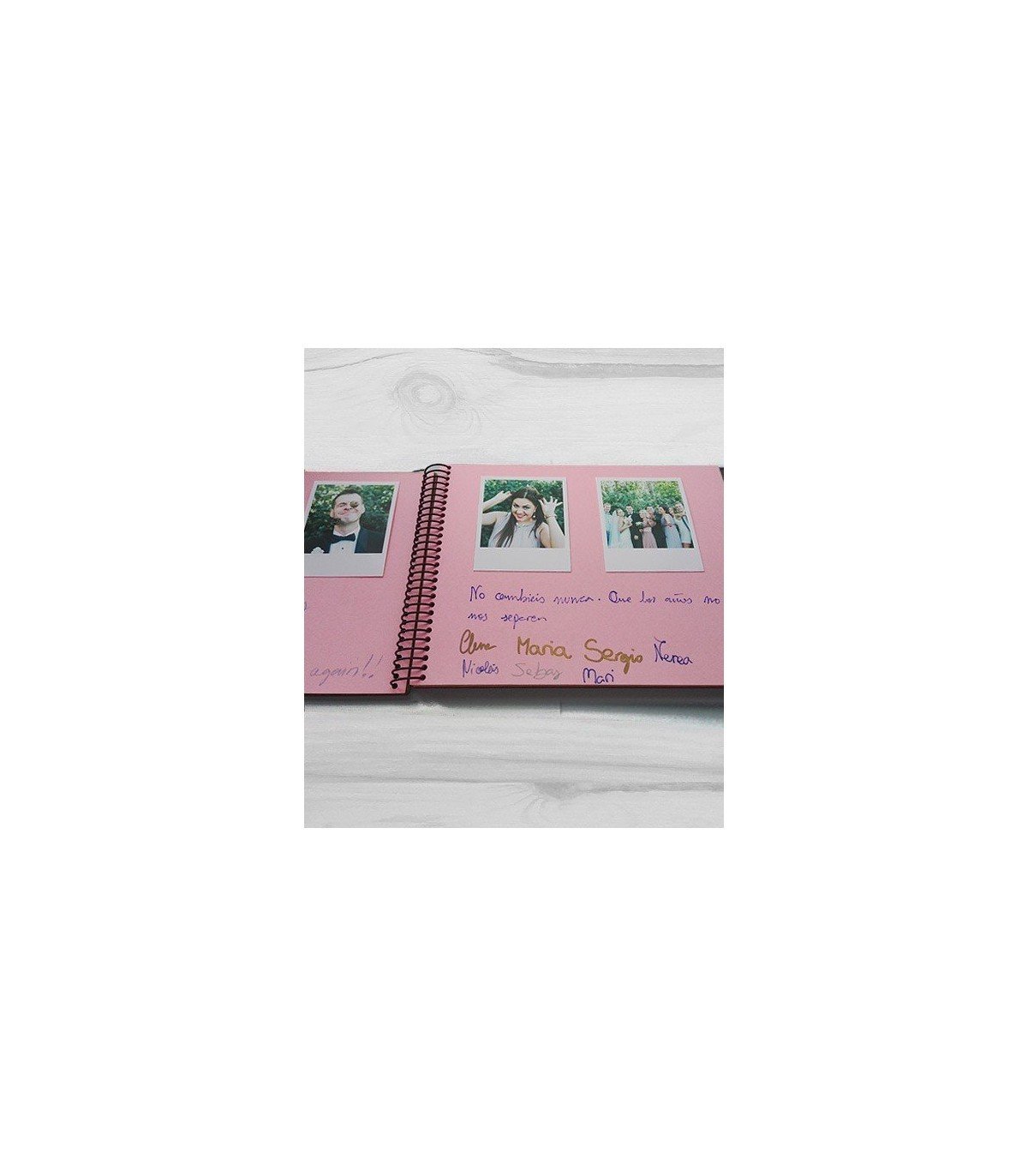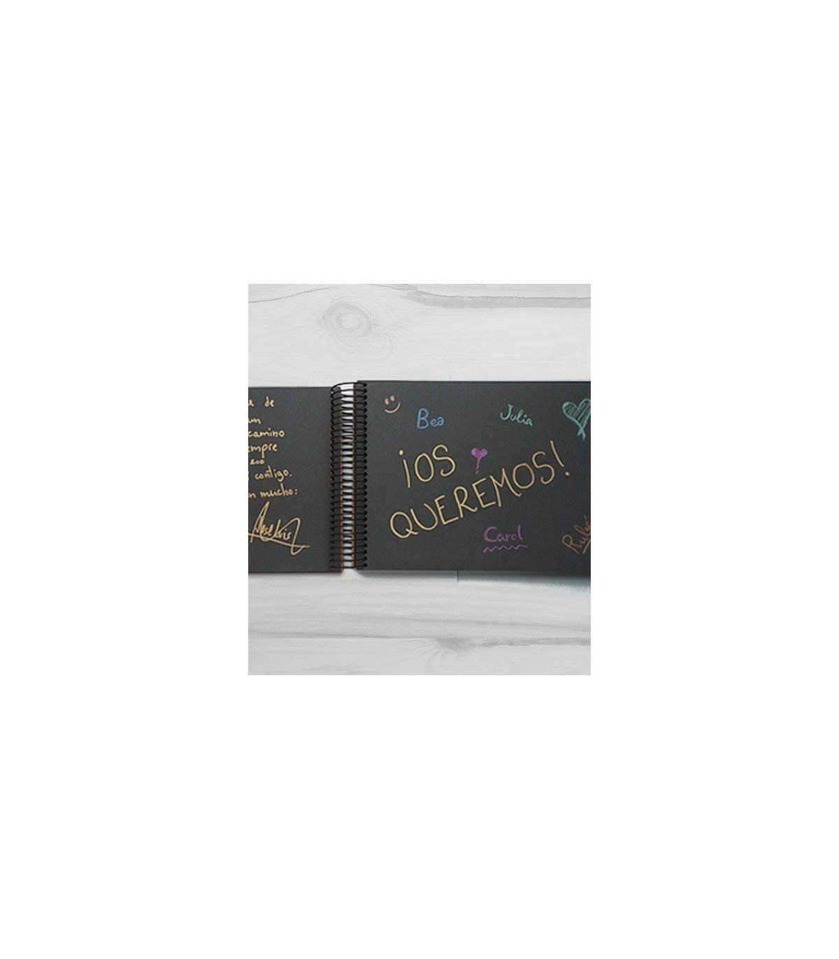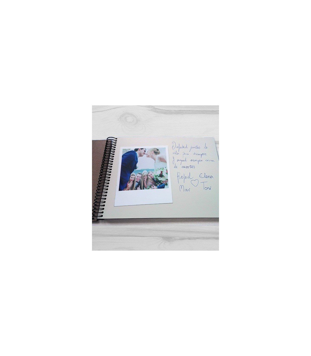 Personaliza este libro de firmas con vuestros nombres y una fecha especial (la fecha es opcional) El texto de la portada está grabado en la madera, lo que garantiza que dure de por vida. La espiral de encuadernado es metálica negra.