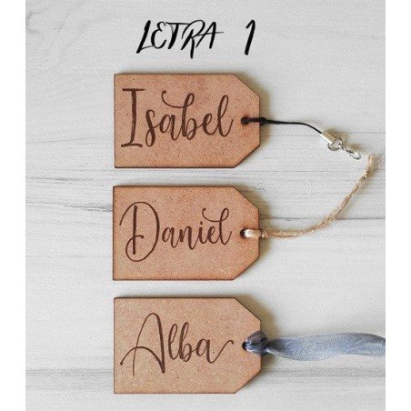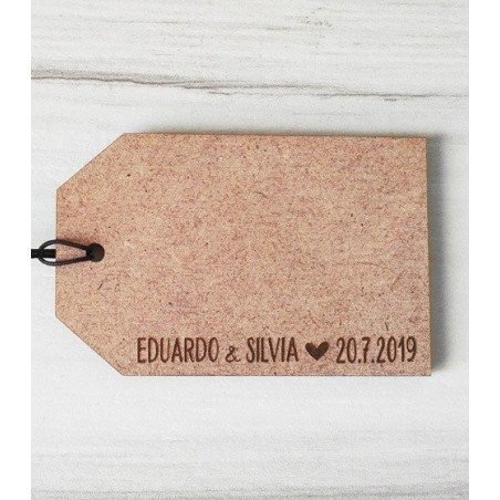 Tag de madera DM de unos 3 mm de grosor con un grabado grande por un lado y otro pequeño por el otro. Se pueden elegir dos complementos: Cuerda o Anilla de llavero para darle un acabado u otro a la etiqueta. También se pueden pedir sin ningún complemento, si quieres darles vuestro toque personal. No olvides seleccionar el tuyo de la lista desplegable al hacer el pedido